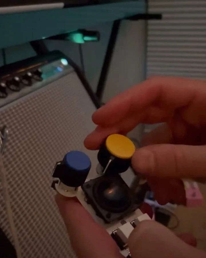 It’s white with big yellow and blue knobs. It’s cute, it’s loud. It’s crunchy, and punchy.
